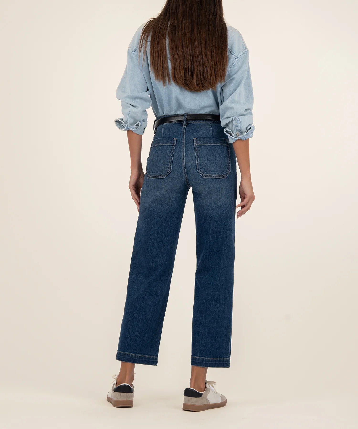 Step up your denim game with these high-rise wide leg jeans in a flattering dark wash. Designed with porkchop pockets, a wide hem, and made from stretchy material, they offer both style and comfort. The structured silhouette and rich color make them a standout choice for any day of the week.