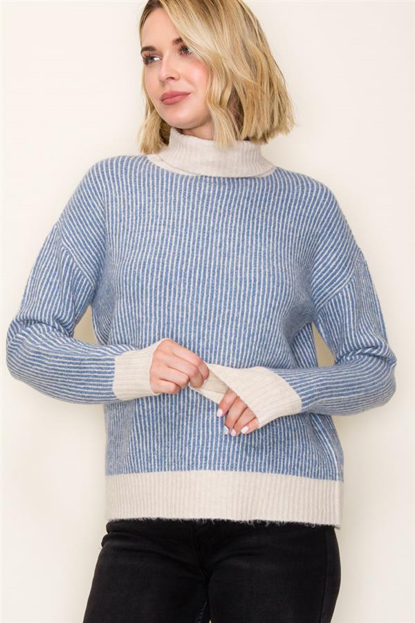 Elevate your cold-weather wardrobe with this marled rib turtleneck, featuring striking color accents that add visual interest to a timeless silhouette. The textured knit construction provides warmth and dimension, while the fitted turtleneck offers classic sophistication. Perfect for layering or wearing solo, this versatile piece transitions seamlessly from casual to polished looks.