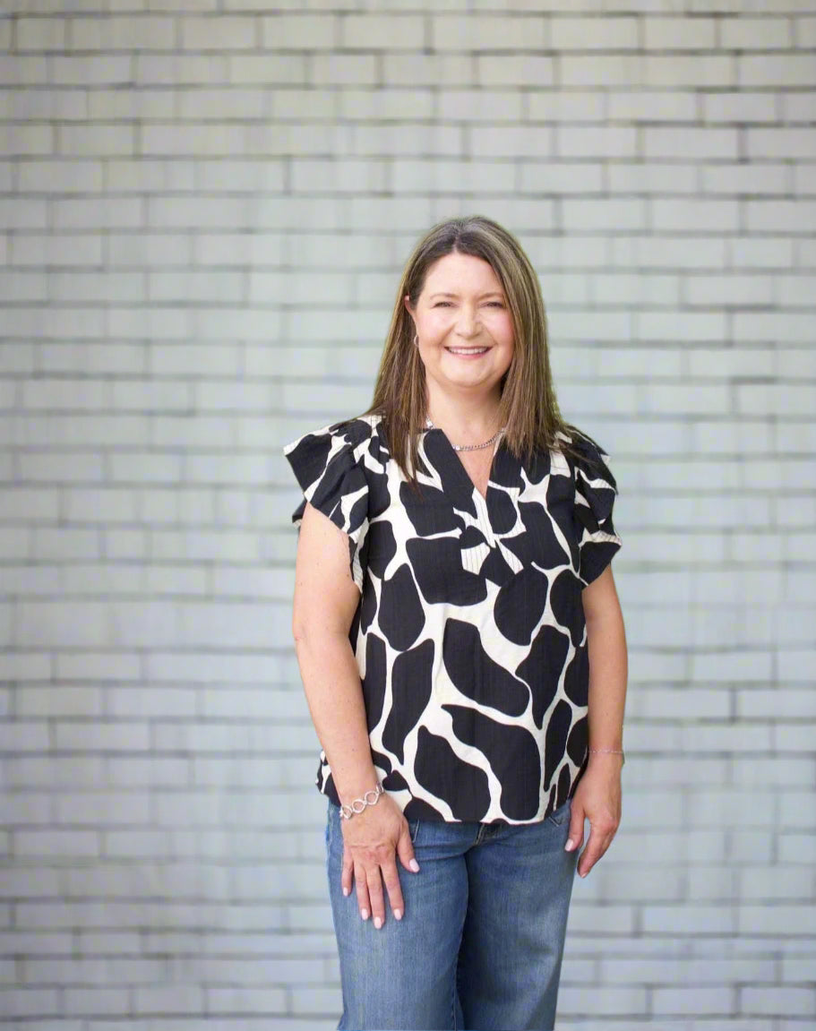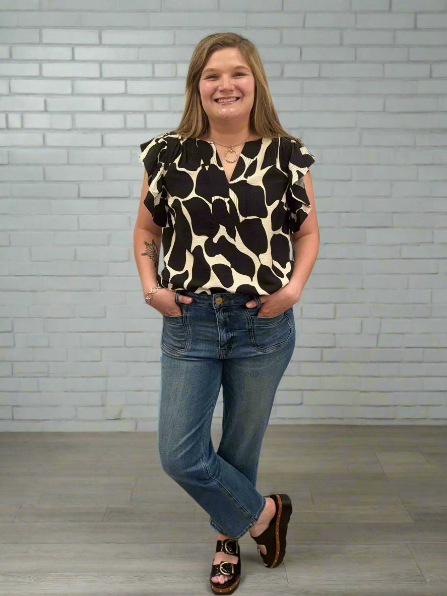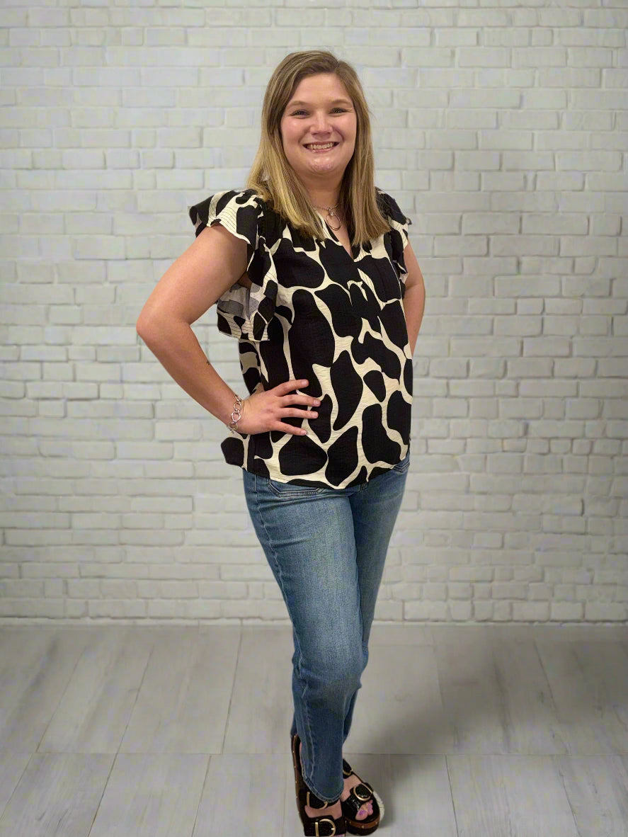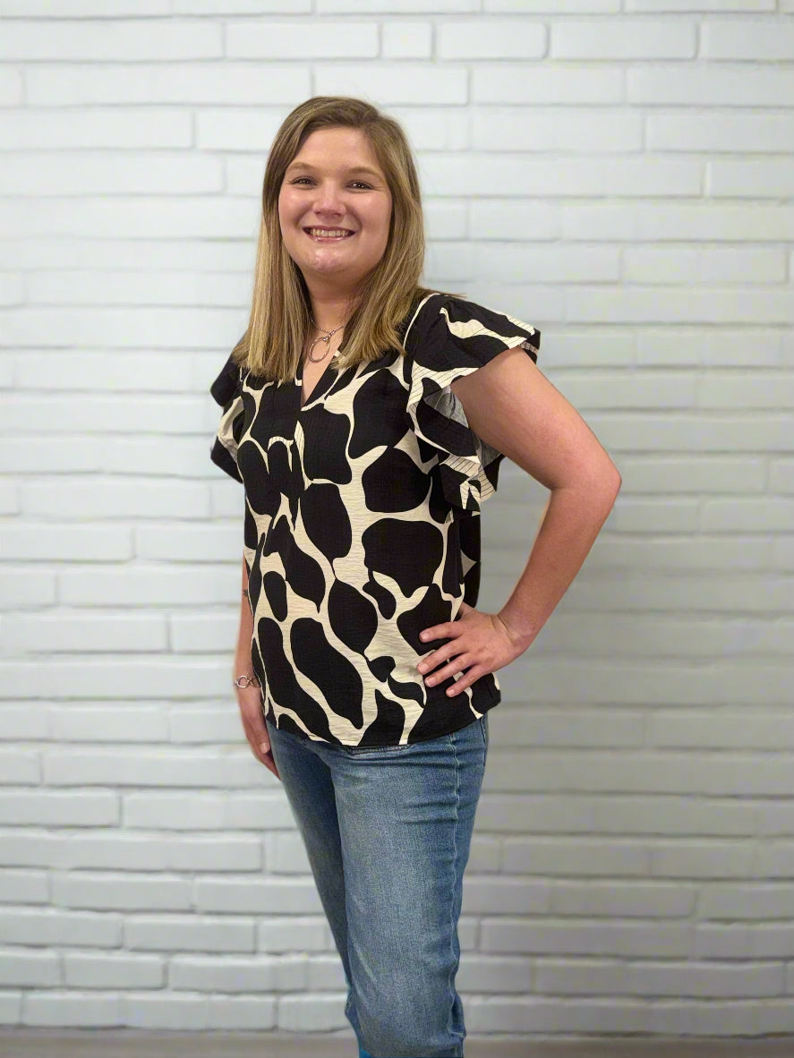Add a wild touch to your wardrobe with this giraffe print blouse featuring playful flutter sleeves and a flattering V-neck. The delicate trapunto stitching adds a unique textured detail, making this top as fun as it is stylish. Perfect for those who love a little adventure in their outfit!