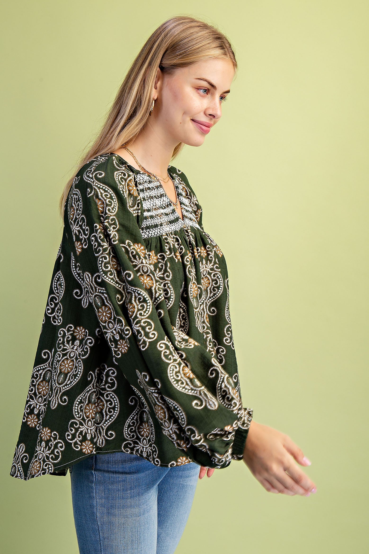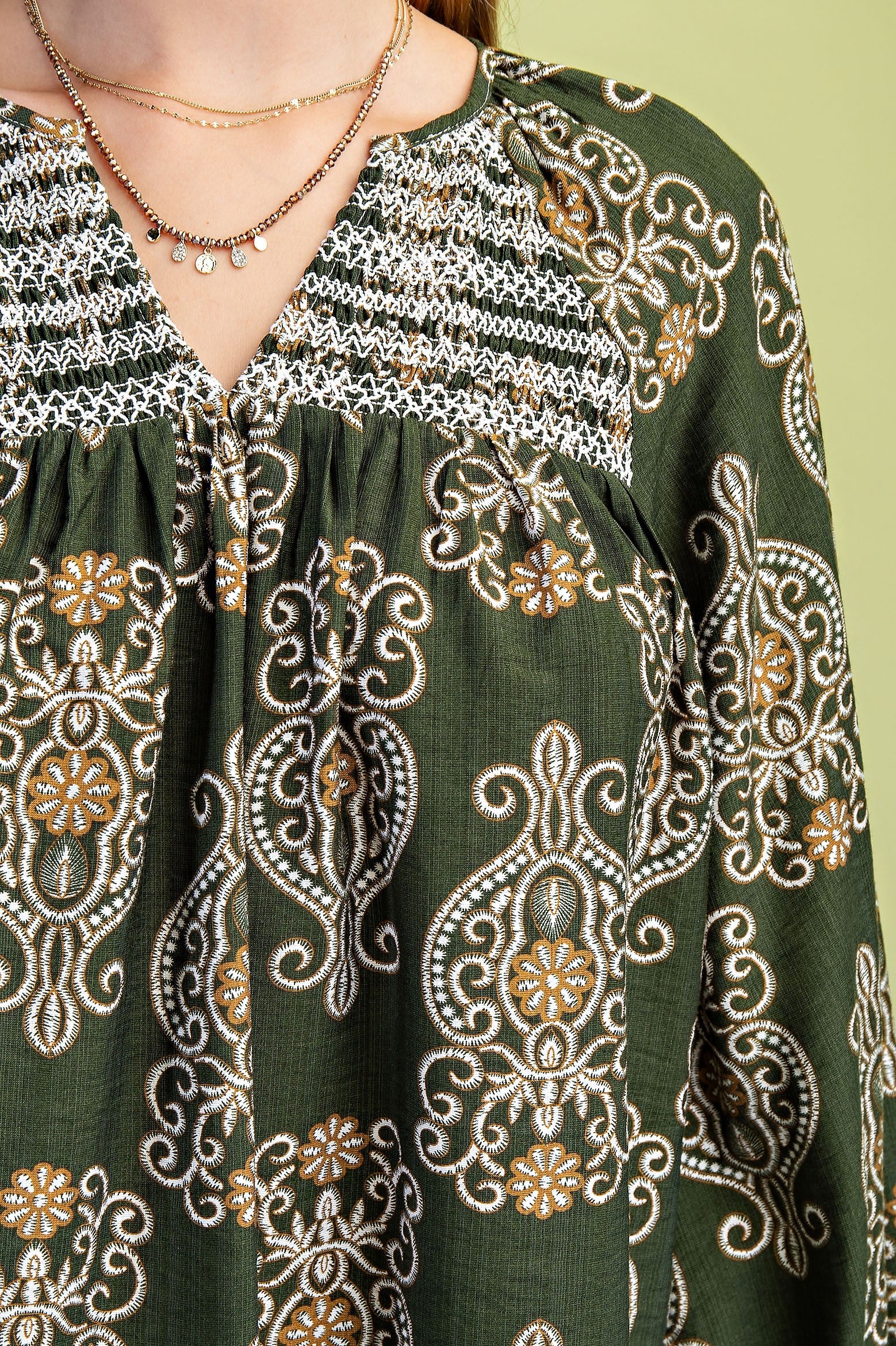 Bring a fun twist to your wardrobe with this Printed Balloon Sleeve V-Neck top. Featuring a playful balloon sleeve design and a charming decorative smocked detail, it adds a touch of whimsy to your everyday look. The flattering v-neckline and unique print make it perfect for effortless style and comfort all day long.
