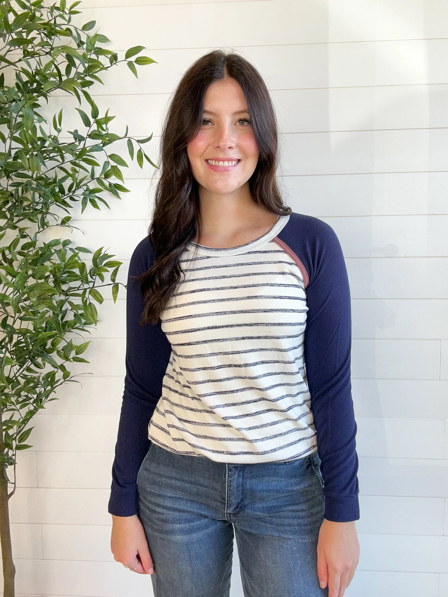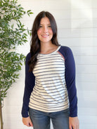 This Contrast Raglan Sleeve Stripe Top is an easy throw-on-and-go piece that still feels a little special. The striped body keeps it classic, while the solid raglan sleeves with contrast piping add a fun twist. Made from a super soft and lightweight blend, it’s the perfect top for layering or wearing solo on casual days.
