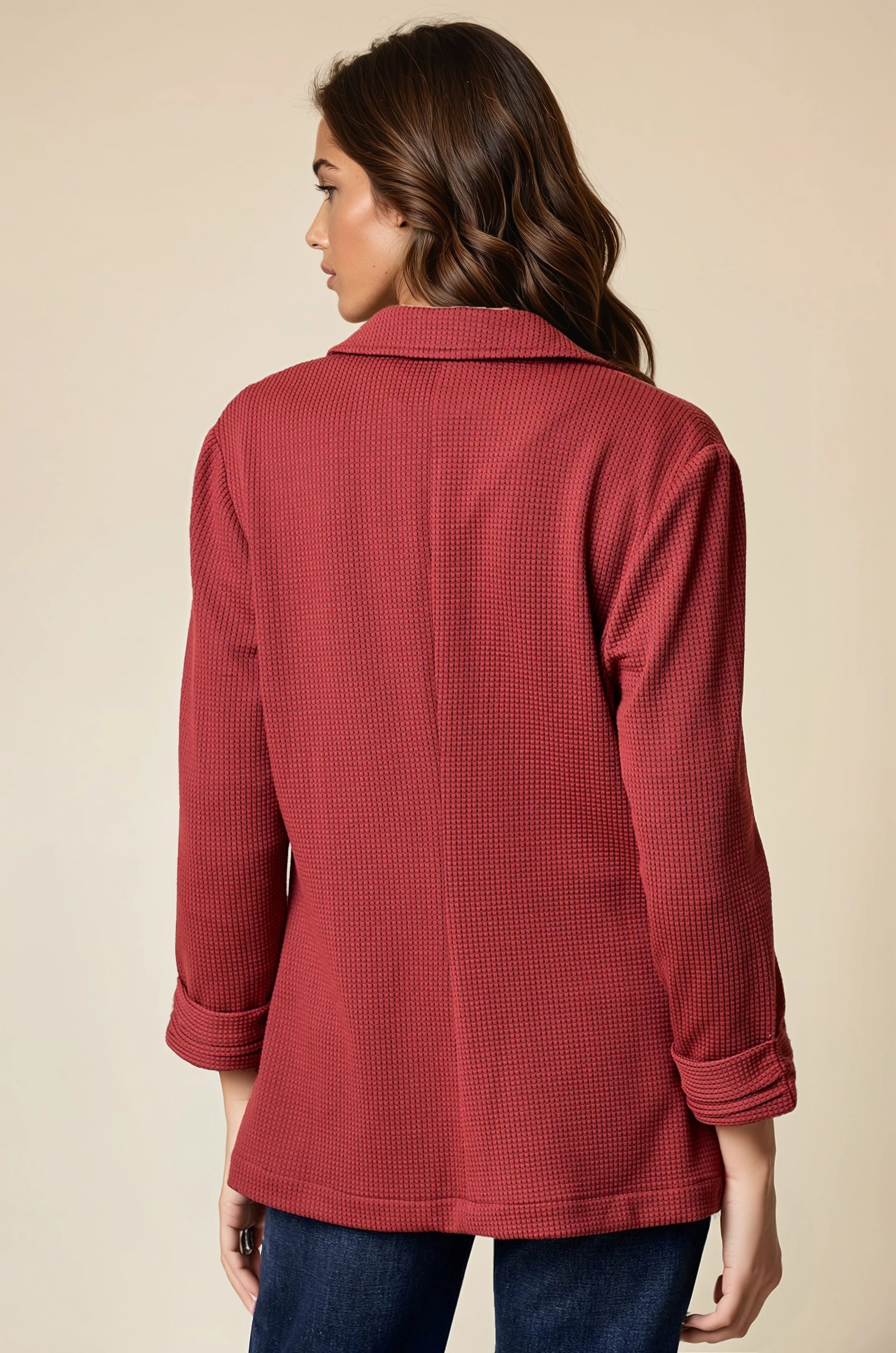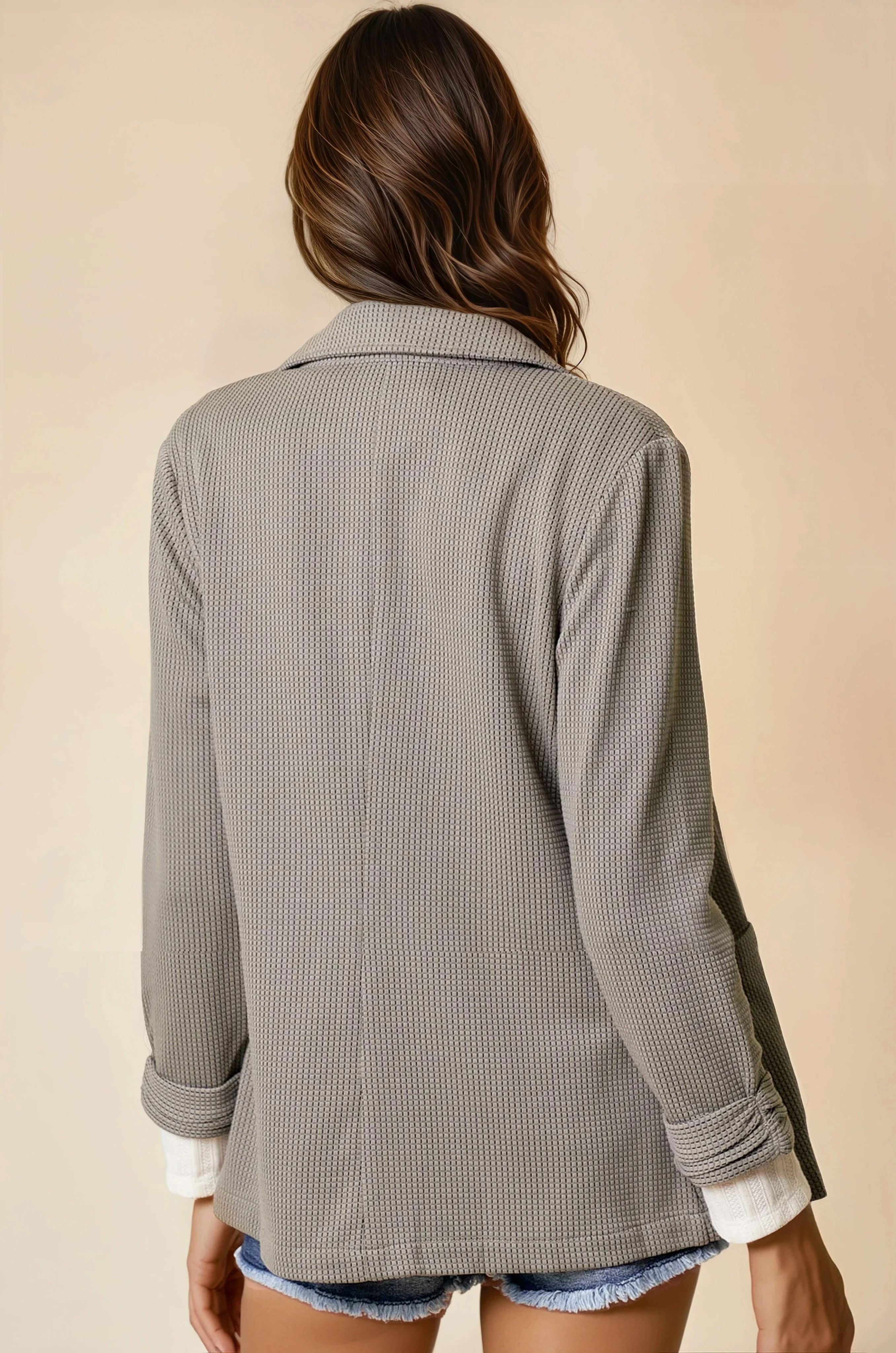 This checked textured blazer features elegantly shirred sleeves, adding a refined yet modern touch to classic tailoring. Crafted for both structure and subtle dimension, it offers a sophisticated silhouette suitable for professional and stylish everyday wear. The unique texture and sleeve detail elevate your outfit while maintaining polished comfort.