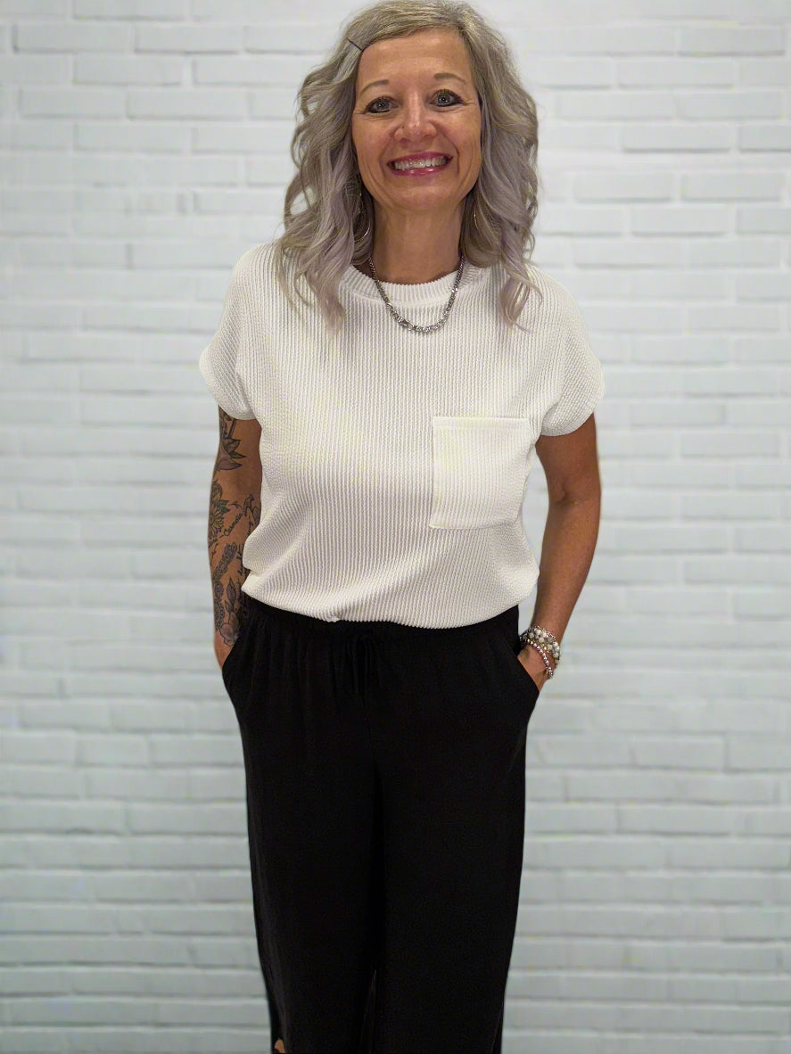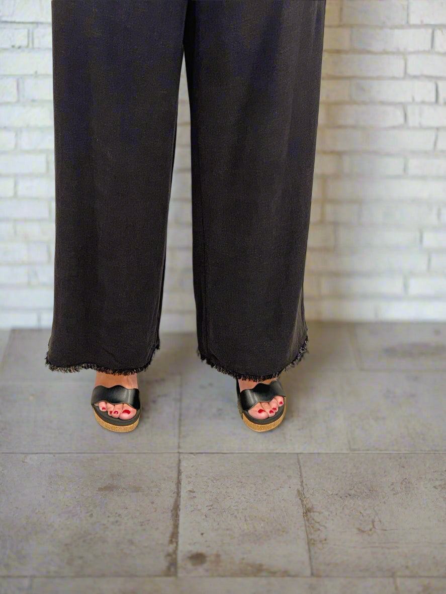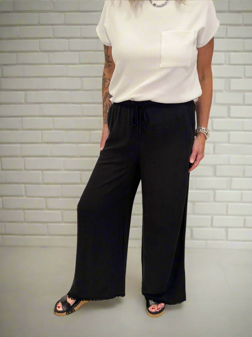 Step out in style with the Soren Pant—black wide-legged pants featuring a trendy frayed edge. These playful pants offer a relaxed fit that moves with you, perfect for adding a touch of effortless cool to any outfit. Featuring an elastic wast with a draw string. Whether you're dressing up or keeping it casual, the Soren Pant brings fun and flair to your wardrobe.