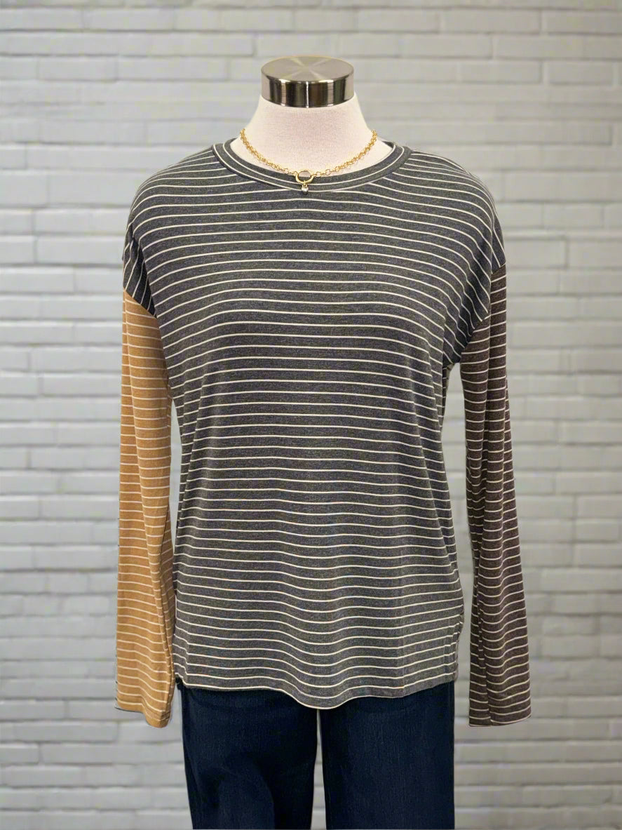 Striped color block crew neck knit top