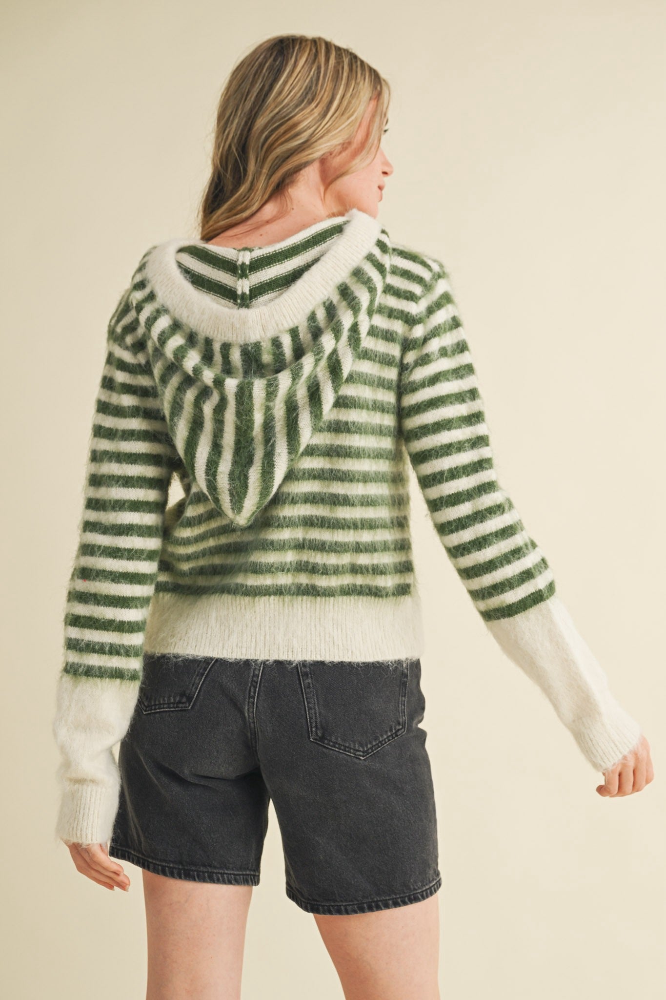 Cozy up in this playful striped hooded cardigan sweater, perfect for adding a splash of fun to your casual look. Its soft fabric and relaxed fit make it ideal for layering on chilly days, while the hood adds an extra touch of comfort and style. Whether you're lounging at home or out for a stroll, this cardigan brings warmth and a cheerful vibe to your outfit.