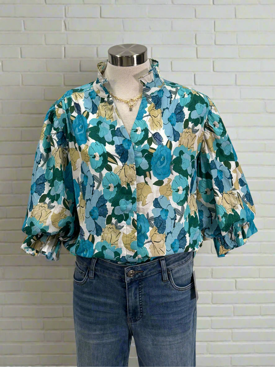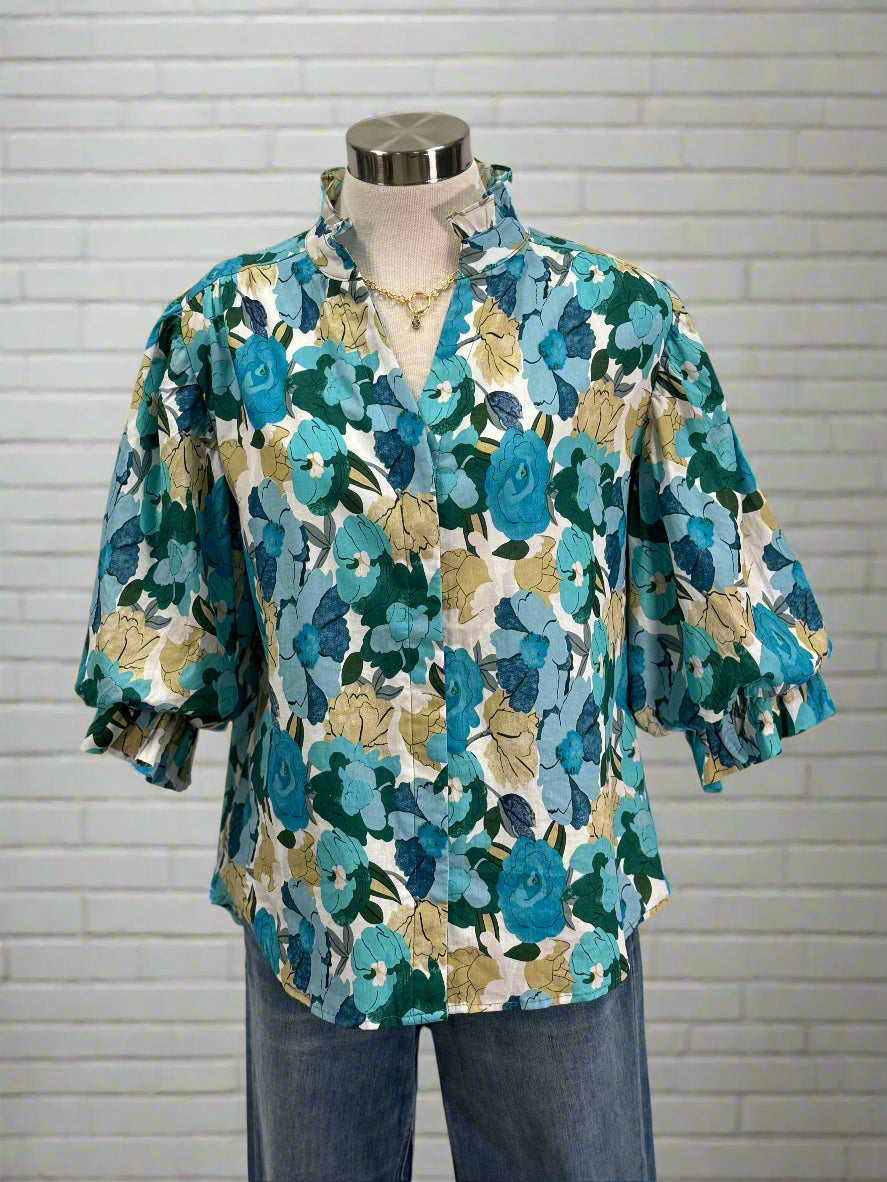 Brighten your wardrobe with this playful button-down top featuring a lively floral print and charming gathered balloon sleeves. Its vibrant design adds a fun pop of color, while the balloon sleeves bring a flirty, whimsical touch perfect for any casual outing or sunny day adventure.