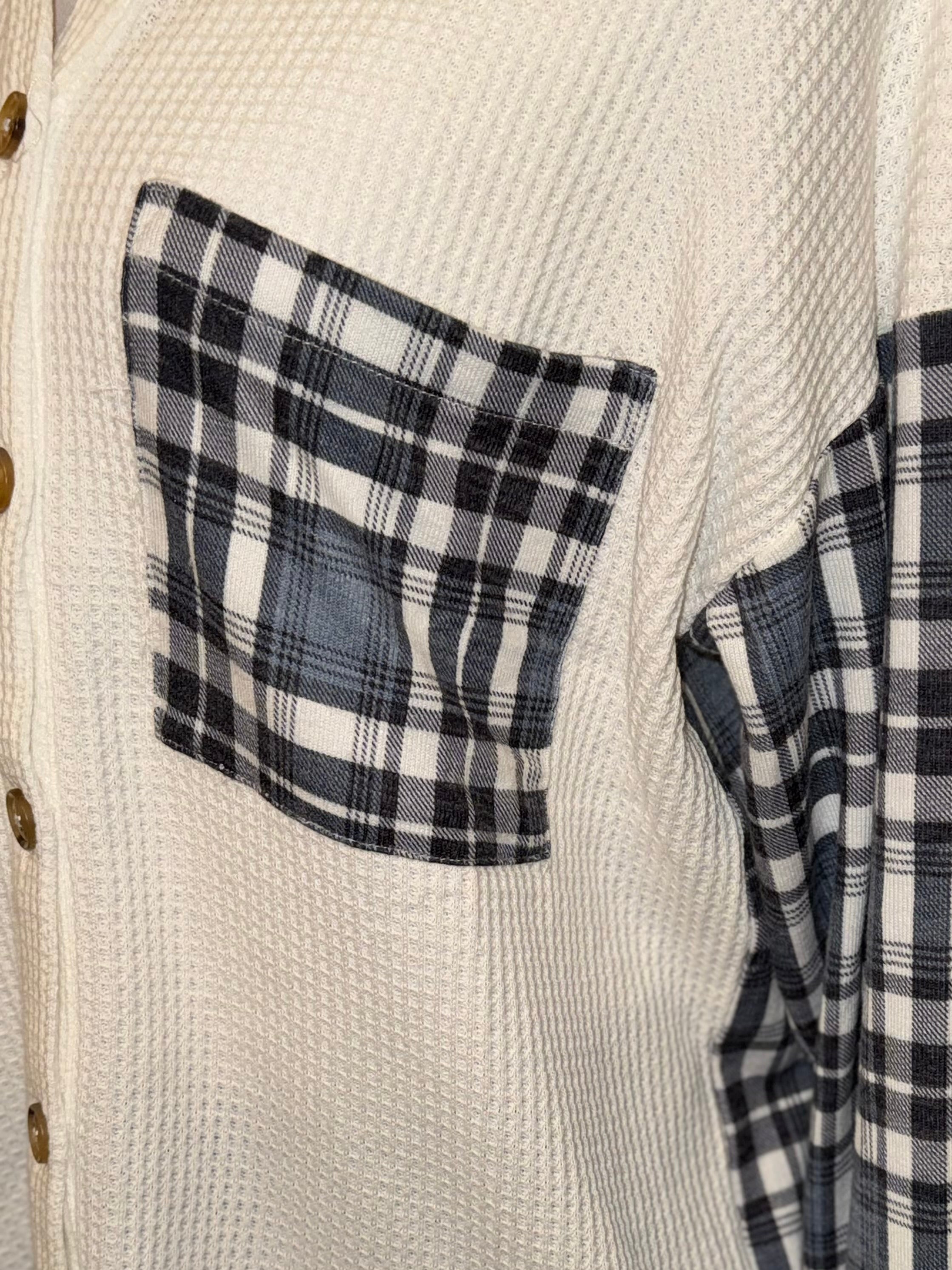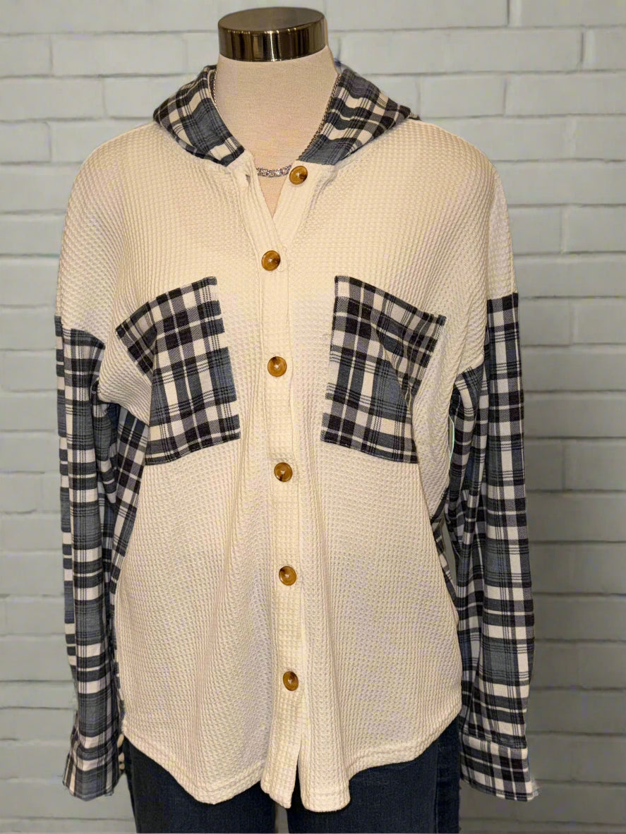 Waffle knit button down plaid hoodie